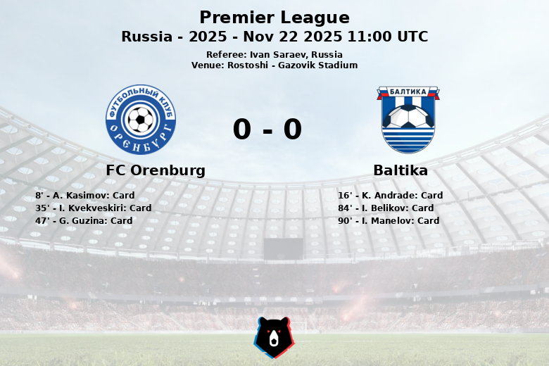 Rostoshi, Russia – In a hard-fought match at the Gazovik Stadium, FC Orenburg and Baltika drew in a game that, while lacking goals, was not short on intensity. Referee Ivan Saraev had a busy afternoon, showing a total of six yellow cards: three for Orenburg and three for Baltika.