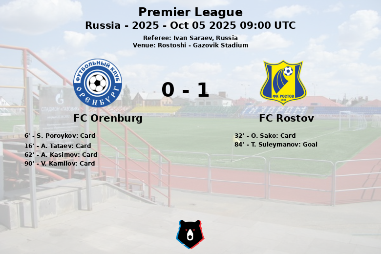 Rostoshi, Russia – In a closely contested match at the Gazovik Stadium, FC Rostov secured a narrow victory against FC Orenburg in a game marked by tactical intensity and numerous fouls. Under the watchful eye of referee Ivan Saraev, the match, corresponding to matchday 11 of the Russian Premier League, 2025 season, remained scoreless until the final minutes.