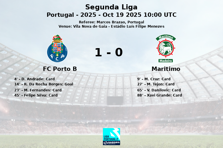 An unfortunate own goal in the 14th minute by R. Da Rocha Borges gave Marítimo the victory in a hard-fought match against FC Porto B at the Estádio Luís Filipe Menezes in Vila Nova de Gaia. The match, corresponding to matchday 8 of the Portuguese Segunda Liga, was marked by strong tactical discipline and a contested game in midfield.
