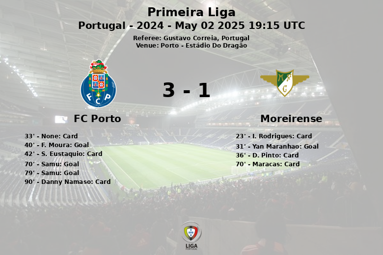 Moreirense took the lead in the 31st minute with a goal from Yan Maranhao, assisted by Alanzinho. However, FC Porto responded quickly. F. Moura equalized in the 40th minute, assisted by F. Vieira. In the second half, FC Porto took control. Samu scored a penalty in the 70th minute and sealed the victory with another goal in the 79th minute, assisted by R. Mora.