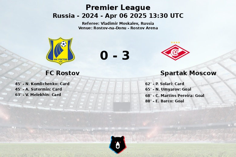 Spartak controlled the ball (64% possession) and created significantly more goal-scoring chances (21 shots, 10 on target), while Rostov managed only 36% possession and just one shot on target. The goals came in the second half. Umyarov opened the scoring in the 65th minute, followed by Martins Pereira in the 68th, and Barco secured the victory in the 88th. Rostov, meanwhile, received two yellow cards and one red card, committing 13 fouls throughout the match. Despite the sending-off and numerous fouls, Rostov managed to create some opportunities, but their lack of accuracy proved crucial. Spartak, with a convincing performance, added three vital points to their title chase.
