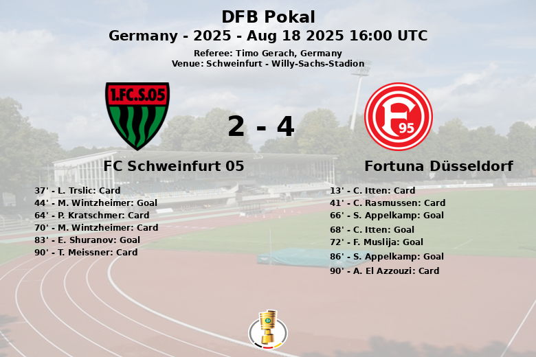 However, Fortuna Düsseldorf demonstrated their ability to react in the second half. S. Appelkamp equalized in the 66th minute, followed by goals from C. Itten in the 68th and F. Muslija in the 72nd, turning the game around. Although E. Shuranov scored for Schweinfurt in the 83rd minute, S. Appelkamp sealed the victory for Fortuna Düsseldorf with his second goal of the match in the 86th minute. The match concluded with a yellow card for A. El Azzouzi of Fortuna Düsseldorf in the 90th minute.