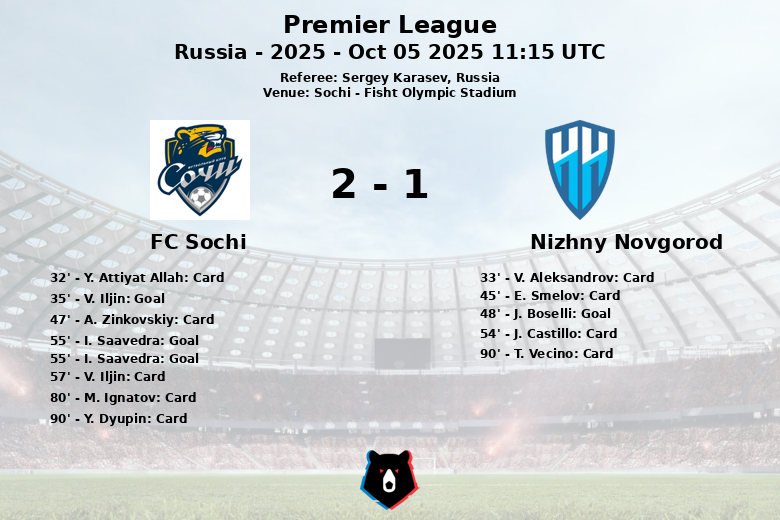 The first half was marked by intensity in midfield, reflected in the yellow cards shown to Y. Attiyat Allah (Sochi) and V. Aleksandrov and E. Smelov (Nizhny Novgorod). FC Sochi took the lead in the 35th minute with a goal by V. Iljin, assisted by F. Kamano.