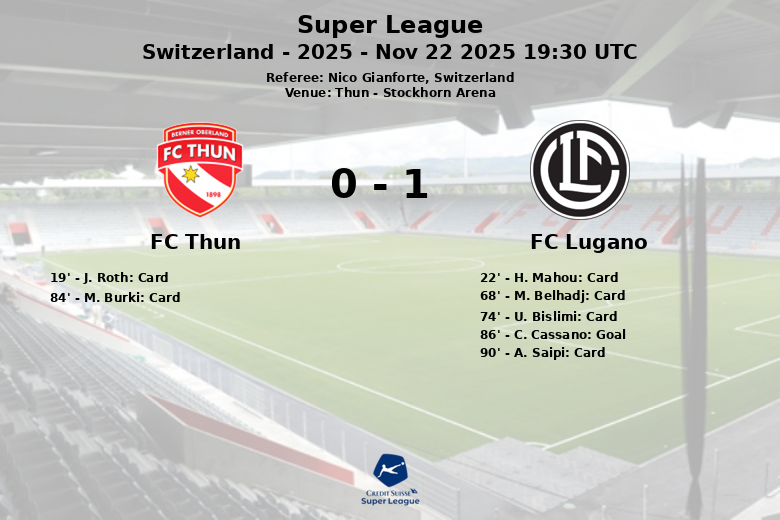 Thun, Switzerland – In a hard-fought match at the Stockhorn Arena, FC Lugano snatched victory against FC Thun with a late goal by C. Cassano in the 86th minute. The match, corresponding to matchday 14 of the Super League, was marked by intensity and high tension.