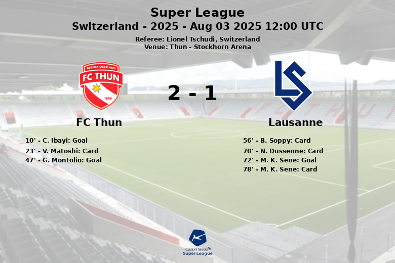 FC Thun took an early lead with a goal by C. Ibayi in the 10th minute, assisted by M. Heule. The home side extended their lead in the 47th minute with a goal by G. Montolio, assisted by F. Fehr. However, Lausanne Sport did not give up, and M. K. Sene scored in the 72nd minute, bringing his team closer on the scoreboard.