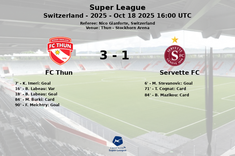 Servette FC opened the scoring early, in the 6th minute, with a goal by M. Stevanovic, assisted by B. Mazikou. However, the joy of the visitors was short-lived, as K. Imeri from FC Thun equalized just a minute later, thanks to an assist from M. Kait.