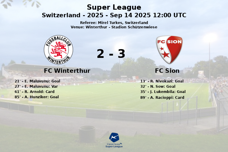 Sion took an early lead thanks to a goal by R. Nivokazi in the 13th minute, assisted by A. Kabacalman. However, Winterthur reacted quickly, with E. Maluvunu leveling the score in the 21st minute with the help of S. Sidler. The home side’s joy was short-lived, as a subsequent goal by Maluvunu was disallowed by VAR in the 27th minute due to a foul.