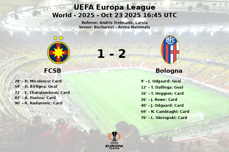 Bucharest, Romania – In an emotionally charged match held at the Arena Nationala, Bologna edged past FCSB with a score of 2 to 1 in the third matchday of the UEFA Europa League group stage. The encounter, officiated by Latvian referee Andris Treimanis, was a tactical battle marked by numerous fouls and cards.
