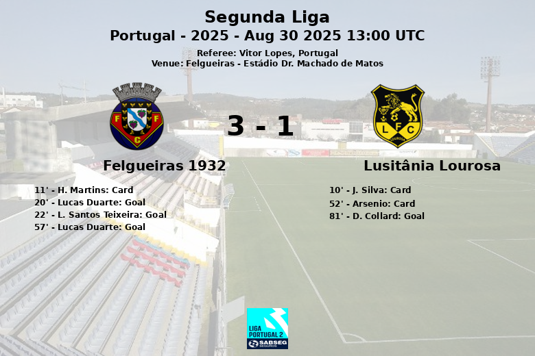 In the second half, Felgueiras did not slow down. Lucas Duarte scored again in the 57th minute, again assisted by V. Moreira, consolidating a comfortable lead. Lusitânia Lourosa tried to react, but the yellow cards to Arsenio (52′) further complicated their situation. In the final stretch, D. Collard managed to reduce the deficit for Lusitânia Lourosa in the 81st minute, assisted by Joao Vasco, but it was a mere consolation. Felgueiras 1932 controlled the rest of the match, securing a convincing victory. Felgueiras 1932 ends with 1 yellow card and Lusitânia Lourosa with 2.