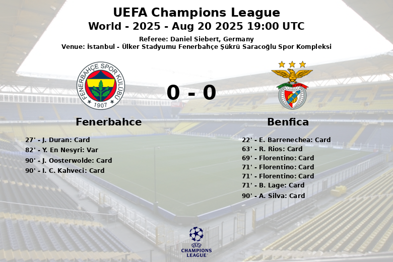 Istanbul, Turkey – In a highly charged match with a controversial ending, Fenerbahçe and Benfica drew at the Ülker Stadyumu Fenerbahçe Şükrü Saracoğlu Spor Kompleksi in the first leg of the UEFA Champions League play-offs. The match, officiated by German referee Daniel Siebert, was characterized by a tight midfield battle and a high number of cards.