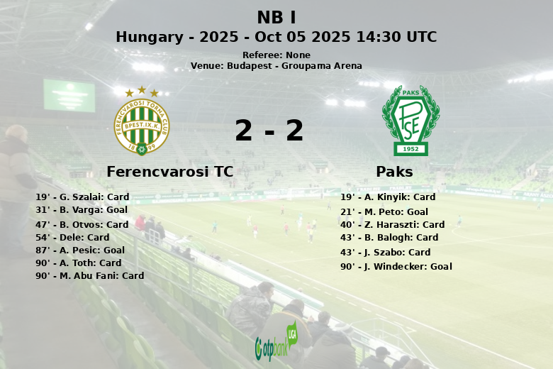 Paks surprised by opening the scoring in the 21st minute with a goal by M. Peto. Ferencvarosi responded with a goal from B. Varga in the 31st minute, leveling the actions. The match was characterized by an intense battle in midfield, reflected in the large number of yellow cards shown to both teams. Paks received four yellow cards, while Ferencvarosi accumulated six.