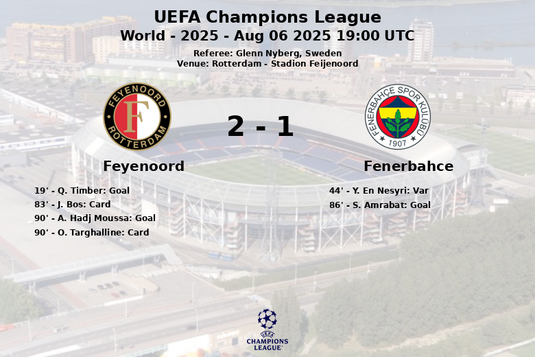 The second half maintained the intensity, with Fenerbahce looking for the equalizer. Finally, S. Amrabat achieved the tie for the Turkish team in the 86th minute. Just when it seemed that Fenerbahce would take the victory, A. Hadj Moussa of Feyenoord scored in the 90th minute, assisted by J. Bos, sealing the final draw.