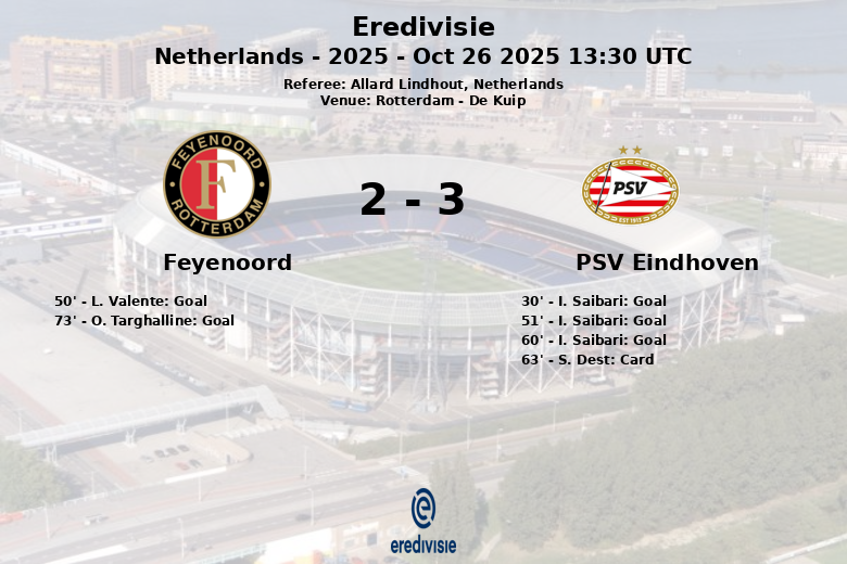 The first goal of the match came in the 30th minute, scored by I. Saibari for PSV, assisted by Mauro Junior. In the second half, Feyenoord equalized in the 50th minute with a goal by L. Valente, assisted by G. Read. The home joy was short-lived, as the following minute, Saibari scored again for PSV, this time assisted by G. Til.