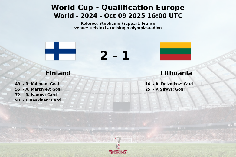 Helsinki, Finland – In a vibrant match held at the Helsingin olympiastadion, Finland secured a crucial victory over Lithuania in the European World Cup qualifiers. The game, officiated by French referee Stephanie Frappart, saw Lithuania take the lead in the 25th minute with a goal by P. Sirvys. However, Finland responded strongly in the second half.