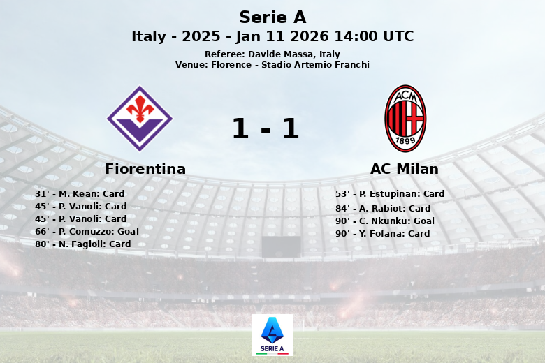 Just when it seemed that Fiorentina would take all three points, AC Milan’s Nkunku equalized the match in the 90th minute, thanks to an assist from Fofana, sealing the final draw. Both teams ended the match with several yellow cards, reflecting the intensity of the game. Referee Davide Massa had a busy afternoon, handing out cards to both sides.