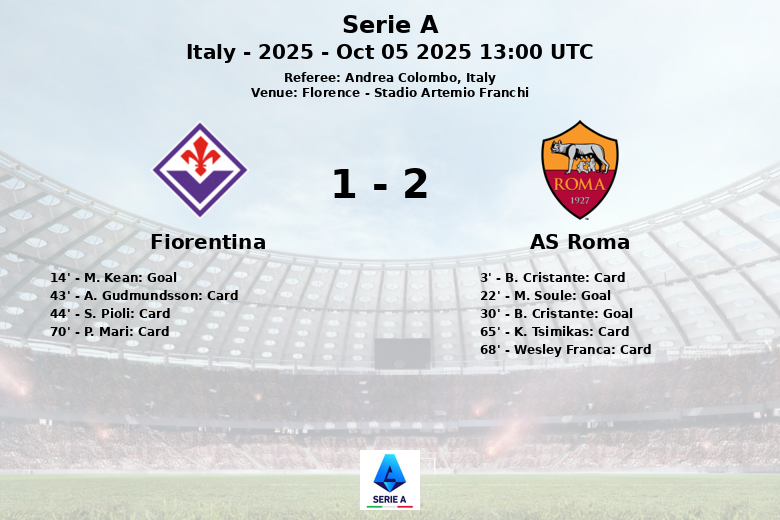Fiorentina opened the scoring early, in the 14th minute, with a goal from M. Kean assisted by H. Nicolussi Caviglia. However, Roma responded strongly. M. Soule equalized in the 22nd minute, thanks to an assist from A. Dovbyk. Eight minutes later, B. Cristante, who had already been booked, put Roma ahead with a goal assisted by M. Soule.