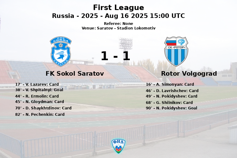 In a game filled with cards and emotions, FK Sokol Saratov and Rotor Volgograd drew at the Stadion Lokomotiv in Saratov, in a match valid for the fifth round of the Russian First League. The match, played on August 16, 2025, saw Sokol Saratov take the lead thanks to a goal by V. Shpitalnyi in the 38th minute. However, Rotor Volgograd fought until the end and managed to equalize in the 90th minute, with a goal by N. Pokidyshev. The match was marked by intensity in the game, reflected in the nine yellow cards shown throughout the match, five for Sokol Saratov and four for Rotor Volgograd.