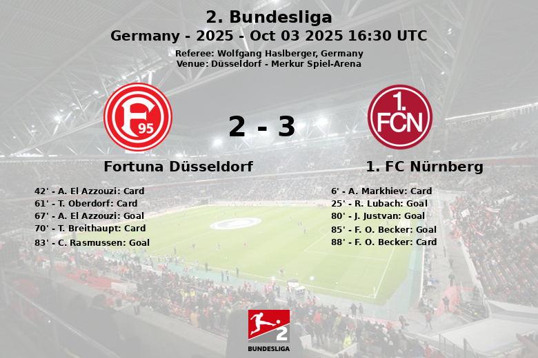 Despite the home pressure, Nürnberg did not give up and found the winning goal in the 85th minute through F. O. Becker, sealing an important away victory. The match was characterized by physical play, reflected in the five yellow cards shown (three for Fortuna Düsseldorf and two for 1. FC Nürnberg). Düsseldorf dominated possession with 54%, while Nürnberg was more effective in their shots, with a total of 17 (7 on target).