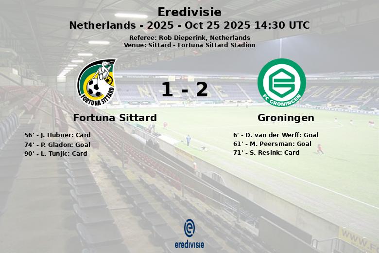 Groningen struck first in the 6th minute with a goal by D. van der Werff, assisted by S. Resink, putting the score at 0 to 1. In the second half, M. Peersman extended Groningen’s lead in the 61st minute with a goal assisted by Y. Taha, making the score 0 to 2. Fortuna Sittard reacted and managed to reduce the deficit in the 74th minute thanks to a goal by P. Gladon, assisted by I. Pinto, leaving the final score at 1 to 2.