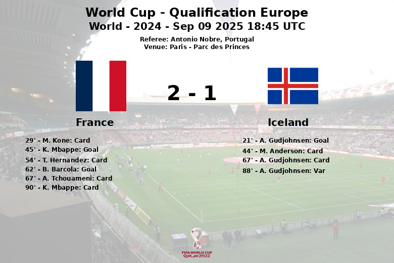 Iceland surprised early on with a goal by A. Gudjohnsen in the 21st minute, unassisted. France responded just before halftime with a penalty goal from K. Mbappe, leveling the score. The second half saw a more dominant France, confirming their superiority with a goal by B. Barcola in the 62nd minute, assisted by Mbappe.