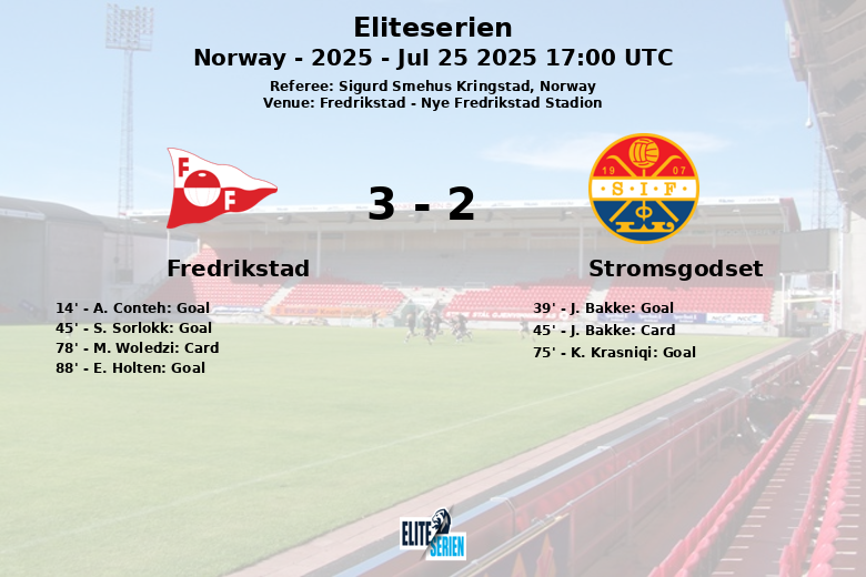 The score opened with an own goal by A. Conteh in the 14th minute, giving Fredrikstad the initial lead. However, Stromsgodset responded in the 39th minute with a goal from J. Bakke, leveling the score. Just before halftime, S. Sorlokk put Fredrikstad back in the lead with a goal in the 45th minute.