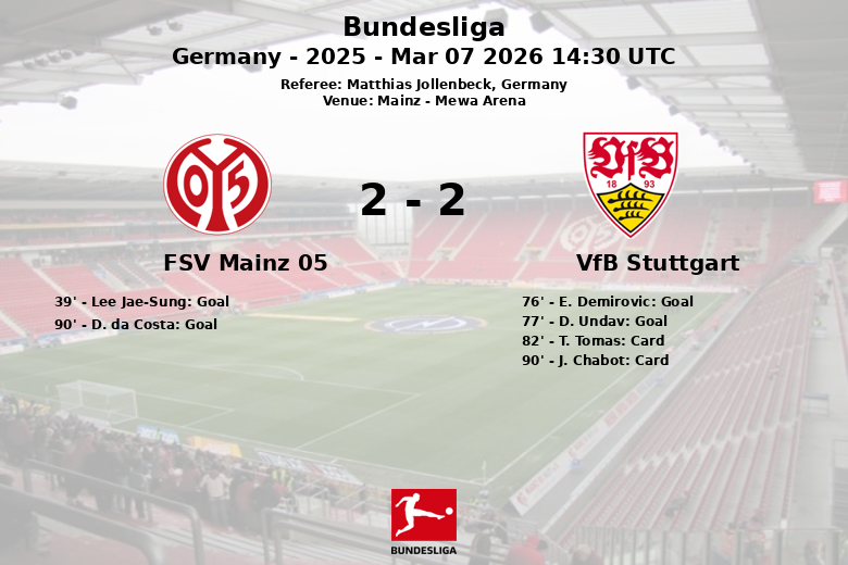 Mainz, Germany – In an exciting match held at the Mewa Arena, FSV Mainz 05 and VfB Stuttgart drew in a game that had an electrifying finish. Mainz 05 took the lead in the 39th minute thanks to a goal by Lee Jae-Sung, assisted by D. da Costa. For much of the second half, Mainz seemed to control the tempo of the match, however, Stuttgart reacted strongly in the final stretch.