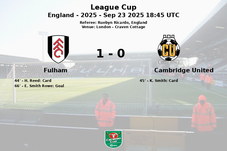 Cambridge United, with 22% possession, tried to defend and look for opportunities on the counterattack. While they generated six shots, none managed to trouble the Fulham goalkeeper. The visiting team conceded more fouls, a total of 12, and saw K. Smith receive a yellow card before halftime. On the Fulham side, H. Reed was also cautioned. Fulham finished the match with 14 shots, 5 directed at the opponent’s goal and 6 off target.
