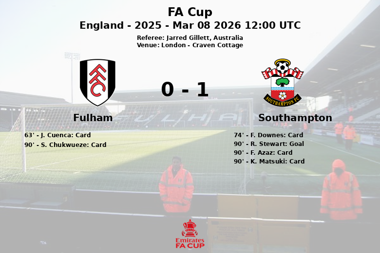 In the final minute of regulation time, a penalty awarded to Southampton was converted by R. Stewart, leveling the score and silencing the home crowd. This goal, coming seemingly out of nowhere, left Fulham with a bitter taste after a match where their dominance did not translate into victory. Australian referee Jarred Gillett officiated the match.