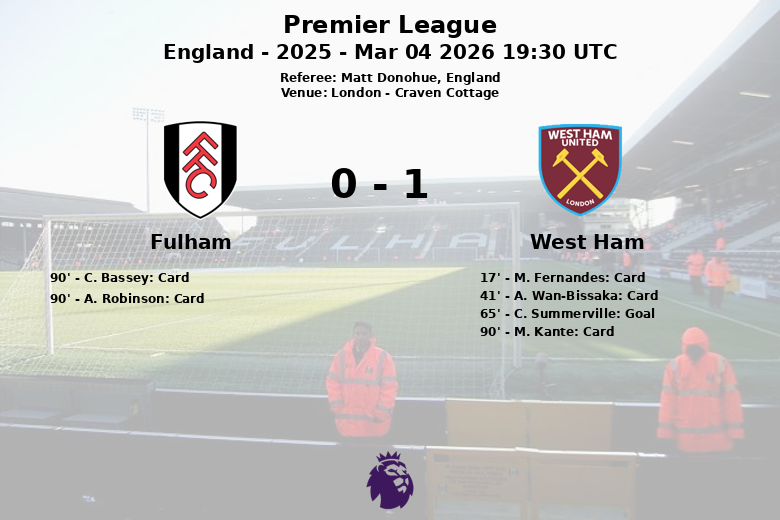 West Ham, with 40% possession, opted for efficiency. In the 65th minute, C. Summerville, with a precise assist from J. Bowen, scored the only goal of the match, sparking euphoria on the visiting bench. The match was filled with tension, reflected in the yellow cards shown to M. Fernandes and A. Wan-Bissaka for West Ham, and to C. Bassey and A. Robinson for Fulham. M. Kanté of West Ham was also booked in stoppage time. Despite Fulham’s 6 corners, West Ham defended well and secured the three points in a crucial Premier League match. Matt Donohue’s refereeing was attentive to the physical play, signaling 12 fouls for West Ham and 14 for Fulham.