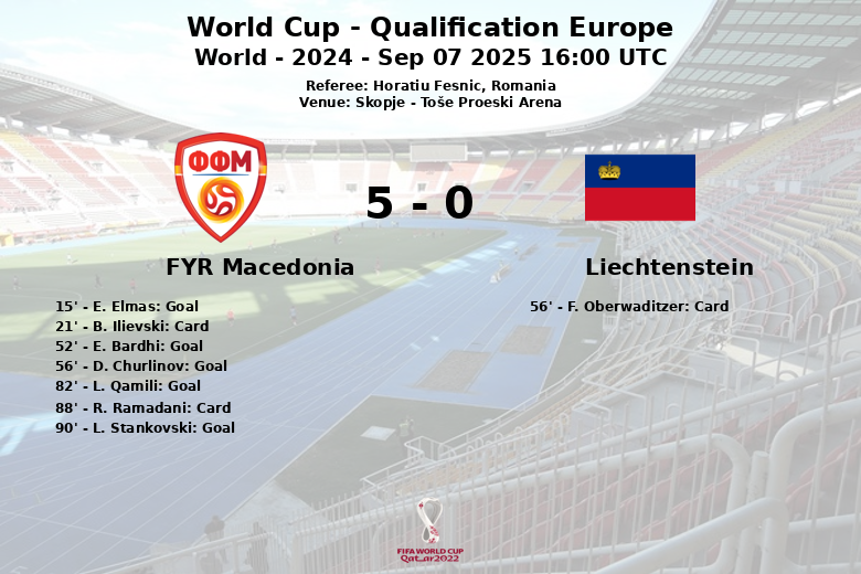 In the final stretch of the match, Luan Qamili scored in the 82nd minute after an assist from Ezgjan Alioski, and Luka Stankovski sealed the rout in the 90th minute, assisted by Gjoko Zajkov. Liechtenstein, despite their efforts, failed to seriously threaten the Macedonian goal. Ball possession reflected the home side’s superiority (71% for North Macedonia versus 29% for Liechtenstein), and the number of shots on goal (9 for North Macedonia versus 1 for Liechtenstein) highlighted the difference in attack. Romanian referee Horatiu Fesnic booked two Macedonian players (Ilievski and Ramadani) and one from Liechtenstein (Oberwaditzer). The match concluded with a final scoreline reflecting the clear difference between the two teams.