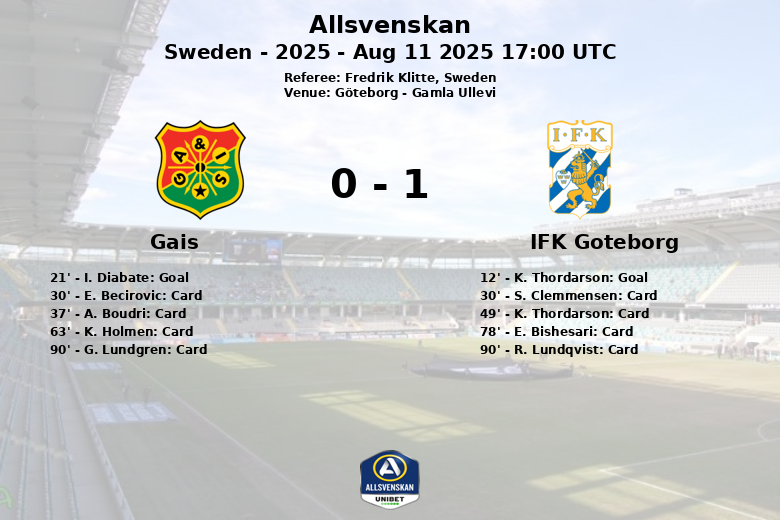 Gothenburg, Sweden – In a hard-fought match at Gamla Ullevi, IFK Goteborg and Gais drew in a game filled with tension and cards. IFK Goteborg took an early lead in the 12th minute with a goal by K. Thordarson, assisted by S. Alioum. However, Gais responded in the 21st minute with a goal by I. Diabate, after a missed penalty where he capitalized on the rebound.