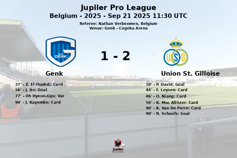 Genk and Union St. Gilloise delivered a vibrant match at the Cegeka Arena, culminating in a draw that reflects the intensity of the game. Union St. Gilloise took an early lead in the 10th minute, thanks to a goal by P. David assisted by C. Burgess. However, Genk, dominating possession with 65%, relentlessly sought the equalizer, which came in the 56th minute with a goal by J. Ito, assisted by J. Steuckers.