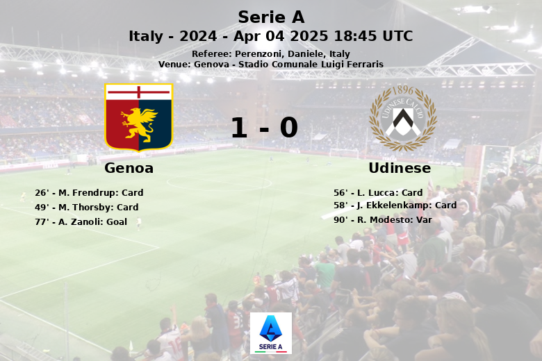 Genoa edged out Udinese with a narrow 1-0 victory at the Stadio Comunale Luigi Ferraris in Genoa. The match, part of the 2024 Serie A’s 31st round, saw the home side claim all three points. Genoa enjoyed slightly more possession (53%), but the game was a hard-fought battle in midfield. Both teams received yellow cards: two for Genoa (Frendrup and Thorsby) and two for Udinese (Lucca and Ekkelenkamp). The only goal of the game came in the 77th minute, courtesy of a strike from Zanoli. Udinese pushed for an equalizer but a late offside call prevented them from scoring. Although Genoa had more shots (13 to 6), they proved more clinical in front of goal.