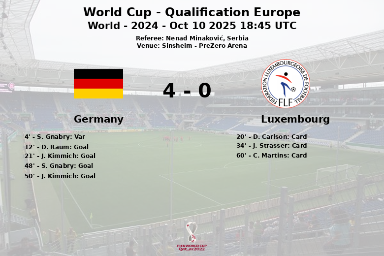 Despite a goal disallowed to Gnabry in the 4th minute due to a VAR review (handball), Germany quickly opened the scoring thanks to Raum in the 12th minute. Carlson’s expulsion in the 20th minute with a red card further complicated Luxembourg’s aspirations, and Kimmich extended the lead by converting a penalty in the 21st minute.