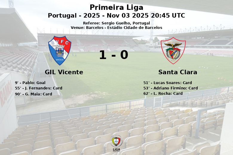 The match was marked by several cautions. For Santa Clara, Lucas Soares, Adriano Firmino, and L. Rocha received yellow cards. For GIL Vicente, J. Fernandes and G. Maia were also cautioned.