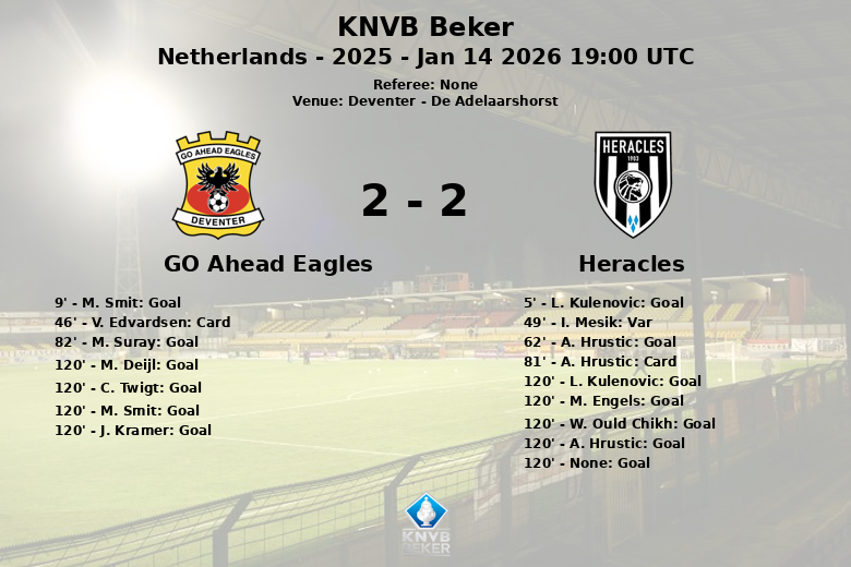 Deventer witnessed a vibrant KNVB Beker clash between Go Ahead Eagles and Heracles Almelo. The match, played at the De Adelaarshorst stadium, ended in a draw that forced a penalty shootout after a tense extra time.