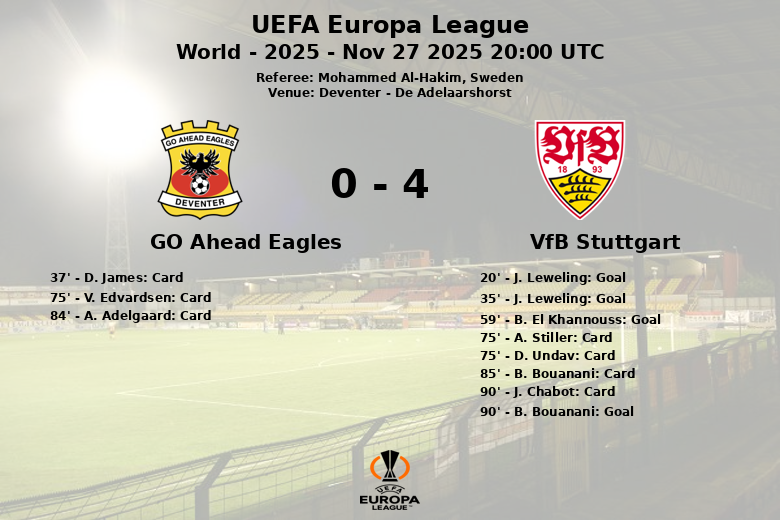 In the second half, Stuttgart continued to dominate. B. El Khannouss scored in the 59th minute, assisted by D. Undav, further solidifying the victory. The match was characterized by intensity and contention, reflected in the multiple yellow cards shown to both teams. For GO Ahead Eagles, D. James, V. Edvardsen and A. Adelgaard received yellow cards. For VfB Stuttgart, A. Stiller, D. Undav, B. Bouanani, and J. Chabot were cautioned. Stuttgart sealed the score in the 90th minute with a goal from B. Bouanani, assisted by L. Assignon. In summary, VfB Stuttgart displayed great effectiveness and control of the game, securing a well-deserved victory on their visit to Deventer.