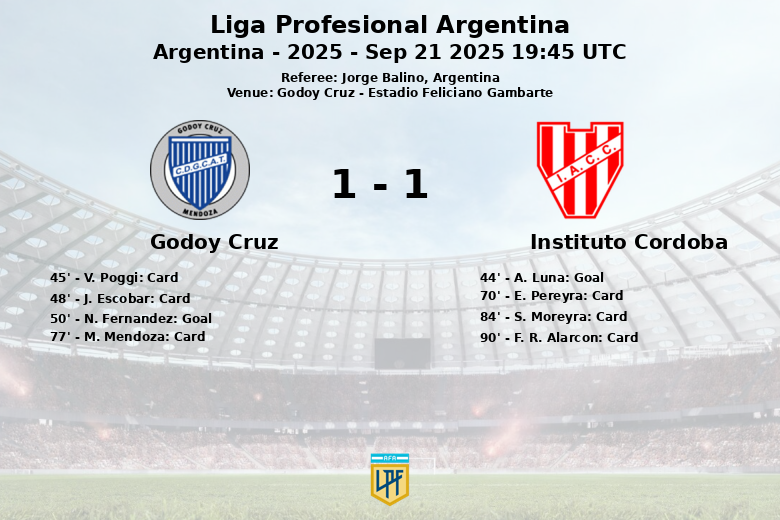 Instituto took the lead in the 44th minute thanks to a goal by A. Luna, assisted by G. A. Lodico, just before halftime. However, Godoy Cruz reacted in the second half and N. Fernández equalized in the 50th minute, assisted by B. Yanez.