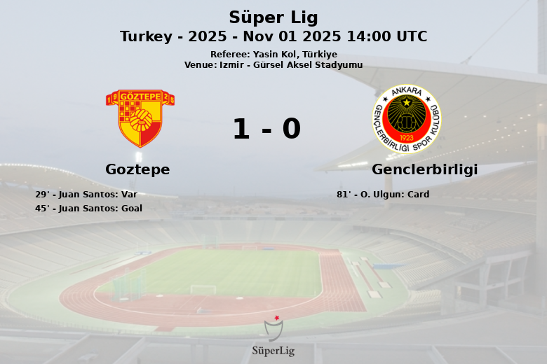 The first half was marked by controversy, with a goal by Juan Santos for Göztepe disallowed by VAR in the 29th minute due to a handball. However, Santos redeemed himself just before halftime, scoring a valid goal in the 45th minute, assisted by N. Miroshi, which ultimately secured the victory for his team.