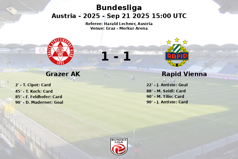 Graz, Austria – In a match played at the Merkur Arena, Rapid Vienna and Grazer AK drew 1-1 in a game filled with tension and yellow cards. Rapid Vienna, with a clear dominance of the ball (67% possession), took the lead in the 22nd minute thanks to a goal by J. Antiste. However, Grazer AK, despite having less possession (33%), fought tirelessly and managed to equalize in the last minute of regular time with a penalty goal scored by D. Maderner.