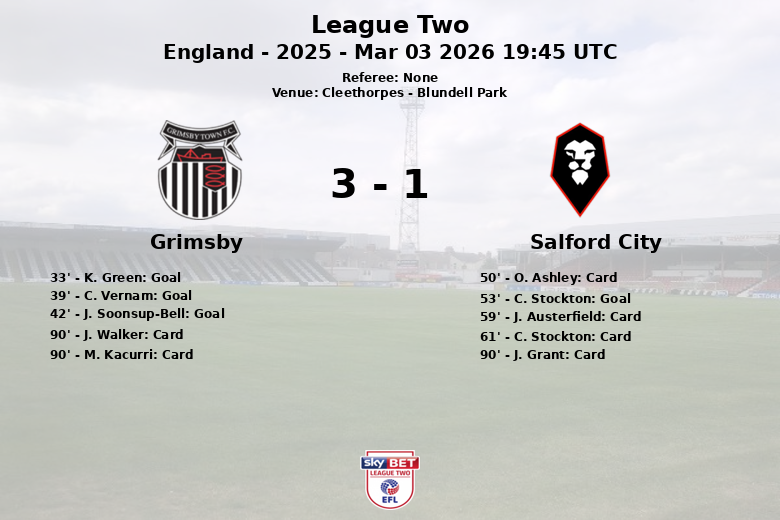 Salford City attempted a comeback in the second half, with C. Stockton scoring in the 53rd minute. However, Grimsby’s defense stood firm, preventing any attempts at a comeback. The match was also marked by a series of yellow cards, with four for Salford City and three for Grimsby Town in the final minutes, highlighting the intensity of the encounter. Despite Salford City having more shots, Grimsby was more accurate.