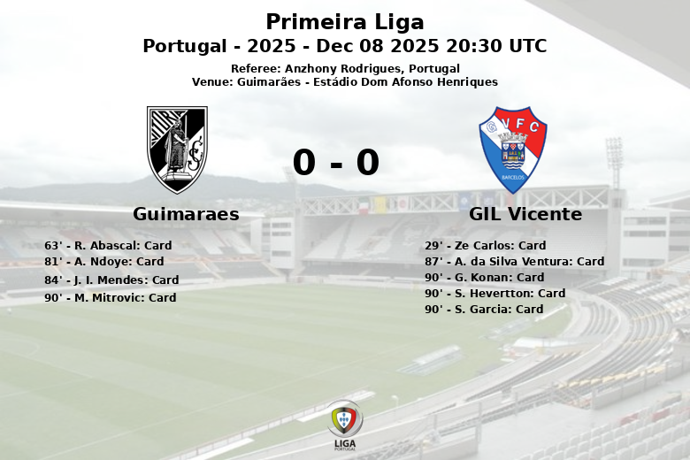 The match was interrupted several times by fouls and cards. Ze Carlos of Gil Vicente was booked in the 29th minute, while R. Abascal (63′), A. Ndoye (81′), J. I. Mendes (84′) and M. Mitrovic (90′) received yellow cards for Guimarães. Gil Vicente also saw cards for A. da Silva Ventura (87′), G. Konan (90′), S. Hevertton (90′) and S. Garcia (90′). The referee booked several players in the final minutes, reflecting the tension and dispute on the field.