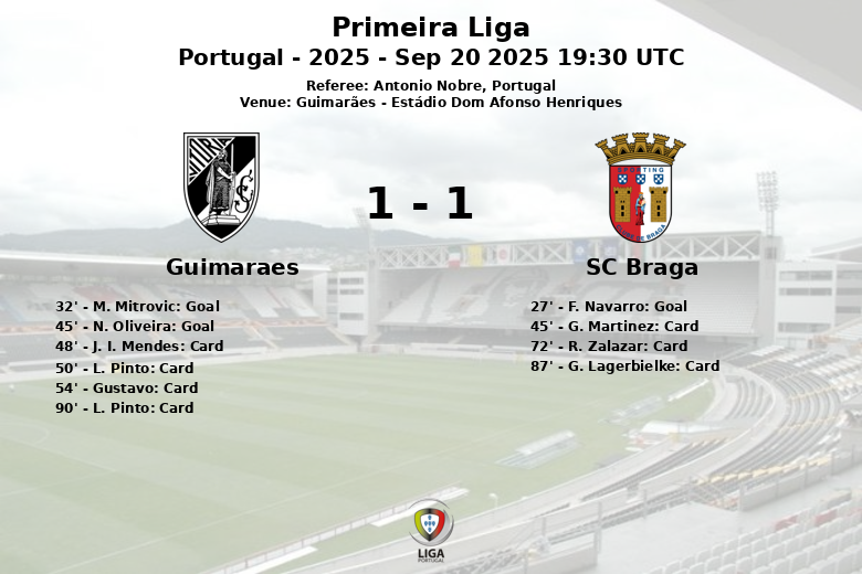 Braga took the lead in the 27th minute with a goal from F. Navarro after a well-executed offensive play. However, the joy was short-lived for the visitors, as Guimarães quickly reacted and equalized in the 32nd minute with a goal from M. Mitrovic, assisted by Gustavo.