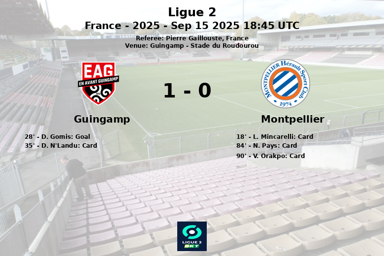 Guingamp, France – In a hard-fought match at the Stade du Roudourou, Guingamp edged out Montpellier with a 1-0 victory in the fifth round of Ligue 2. The sole goal of the match came in the 28th minute courtesy of D. Gomis, who capitalized on an assist from E. Koffi to send the ball into the back of the net.
