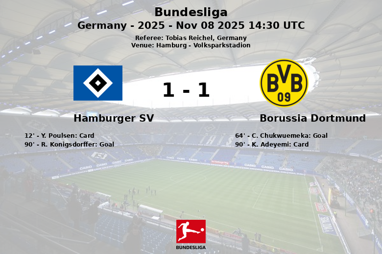 The match was tactical, with Hamburg defending solidly and looking for opportunities on the counterattack. Dortmund, with more possession, tried to break through the home team’s defensive block but encountered a well-organized side. The game remained goalless until the 64th minute when C. Chukwuemeka, assisted by N. Schlotterbeck, opened the scoring for Dortmund. Hamburg did not give up, and in the 90th minute, Konigsdorffer, assisted by M. Muheim, scored the equalizing goal, unleashing euphoria in the stands. The match also had tense moments, with yellow cards for Y. Poulsen of Hamburg and K. Adeyemi of Dortmund.