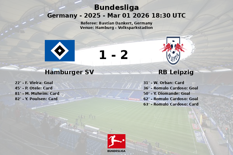 Hamburg, Germany – An exciting match at the Volksparkstadion saw Hamburger SV and RB Leipzig draw in an action-packed game. The home team, with 41% possession, managed to open the scoring in the 22nd minute with a goal by F. Vieira, assisted by W. Mikelbrencis. However, RB Leipzig, dominating possession with 59%, responded with a goal from Romulo Cardoso in the 36th minute, thanks to an assist by R. Baku.