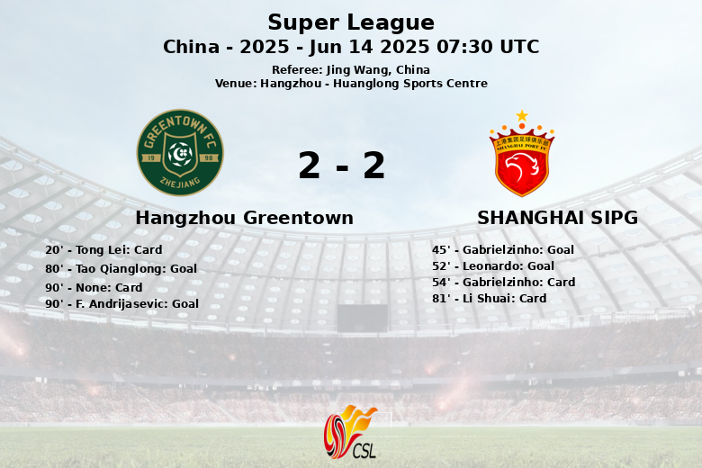 The first half saw SHANGHAI SIPG take the lead just before halftime with a goal from Gabrielzinho in the 45th minute. The first half was also marked by a yellow card for Tong Lei of Hangzhou Greentown in the 20th minute.