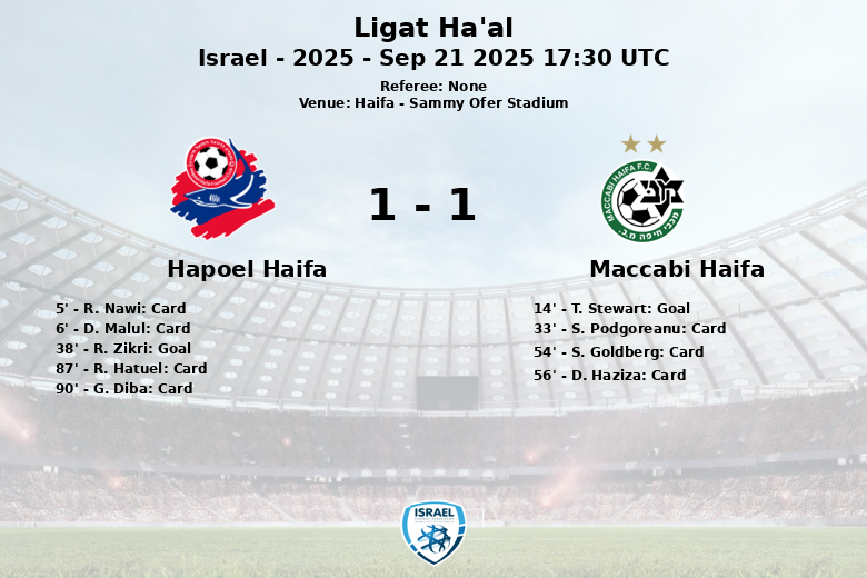 The match began with intensity, reflected in the early yellow cards for R. Nawi and D. Malul of Hapoel Haifa in the 5th and 6th minutes, respectively. Maccabi Haifa took the lead in the 14th minute with a goal by T. Stewart, assisted by S. Podgoreanu.
