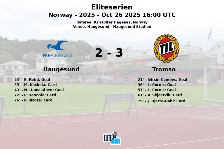 In the second half, L. Cornic scored again for Tromsø in the 51st minute, giving the visiting team a lead that they managed to maintain until the end. The match was characterized by physical play, with several yellow cards shown to players from both teams (M. Koskela, P. Hannola, and P. Bizoza for Haugesund, and V. Skjaervik and J. Hjerto-Dahl for Tromsø).