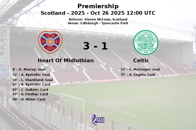 Celtic took an early lead thanks to a goal by C. McGregor in the 12th minute, assisted by K. Tierney. However, Heart Of Midlothian didn’t back down and found the equalizer in the 8th minute with an own goal by D. Murray. The second half was a goal festival for the home side. A. Kyziridis put Heart Of Midlothian ahead in the 52nd minute, and two minutes later L. Shankland extended the lead with a penalty goal.